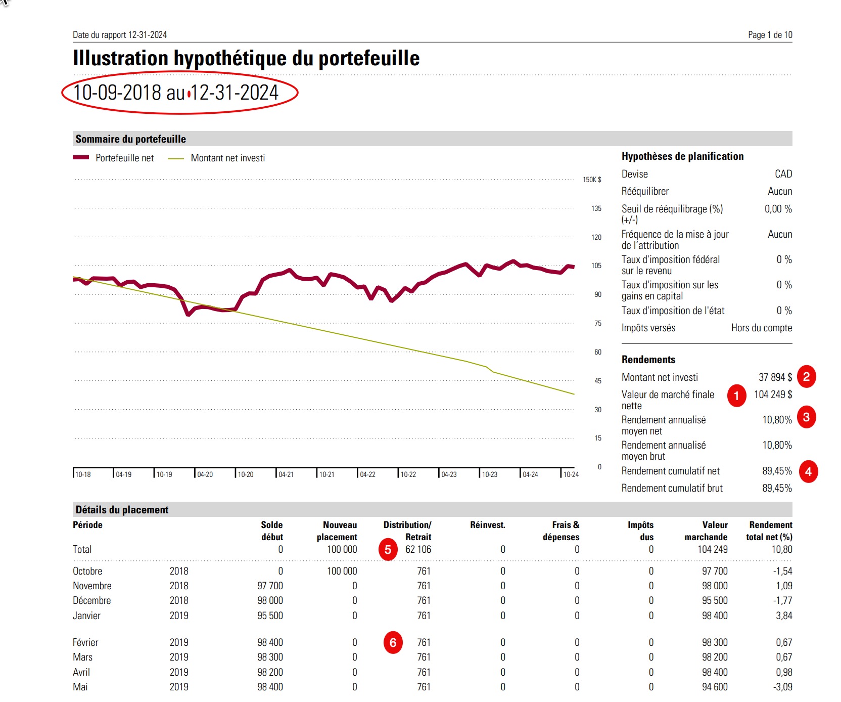 Simulation de portefeuille entre le 10 septembre 2018 et le 31 décembre 2024, montrant la performance d'un investissement de 100 000 $, avec une valeur de marché finale de 198 018 $.
